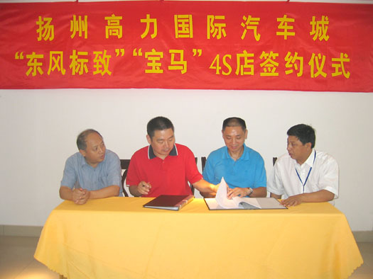 2007年7月18日,揚州高力國際汽車城與揚州金鑫房地產(chǎn)公司在揚州分公司四樓會議室舉行了“東風標致”、“寶馬”4S店簽約儀式,總經(jīng)理陳利平、集團商管中心孫志明副總參加了此次簽約儀式。