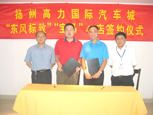 2007年7月18日,揚州高力國際汽車城與揚州金鑫房地產(chǎn)公司在揚州分公司四樓會議室舉行了“東風標致”、“寶馬”4S店簽約儀式,總經(jīng)理陳利平、集團商管中心孫志明副總參加了此次簽約儀式。